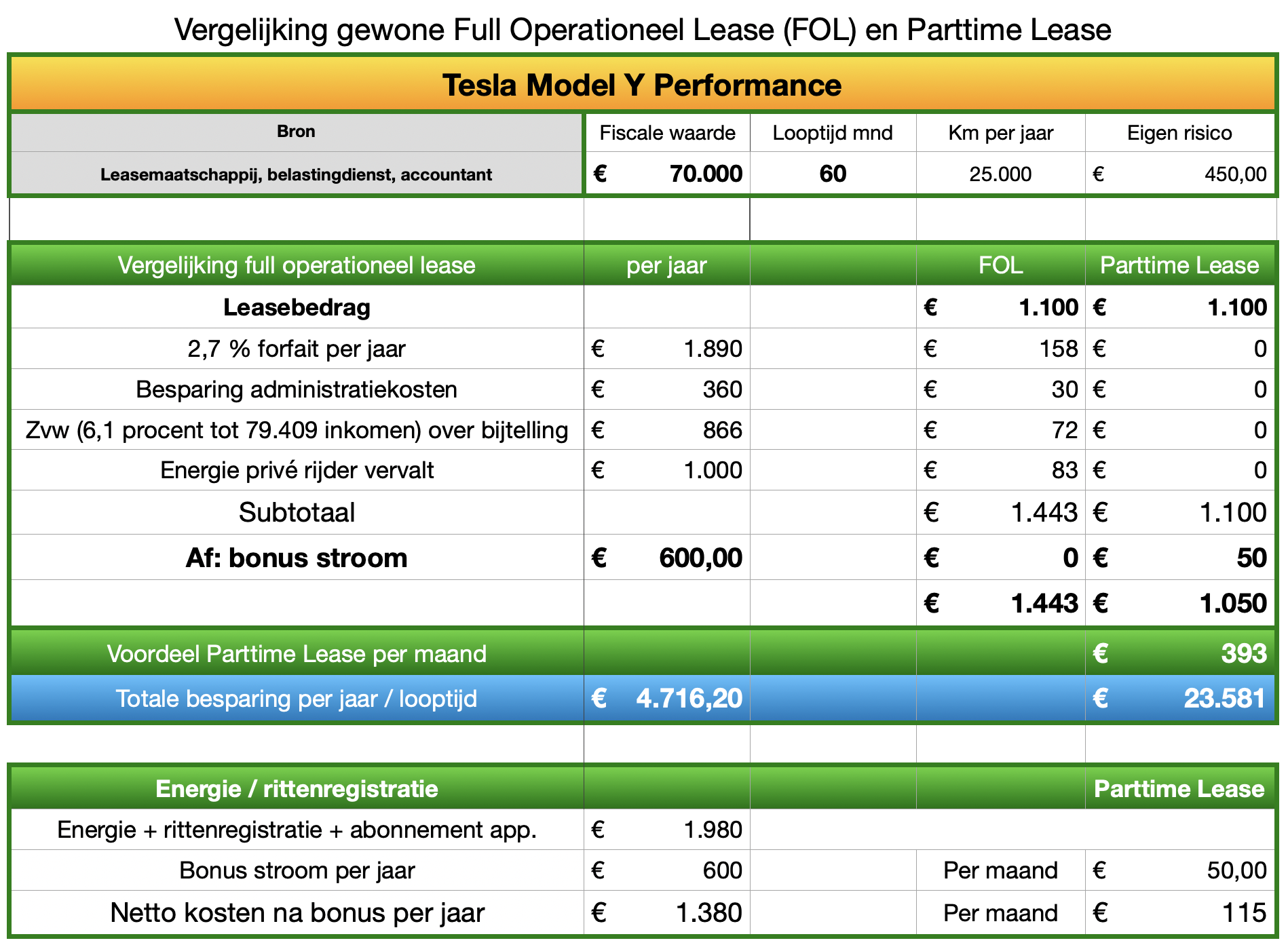 Wij willen elektrisch rijden dichterbij brengen en vooral veel voordeliger. Daarom adviseren wij om als bedrijf geen Auto’s van de Zaak in te zetten, want dat maakt autorijden ontzettend duur. Wanneer je uitsluitend zakelijk met één of meer auto’s voor je bedrijf rijdt, bespaar je tot 40 procent op de autokosten die je nu betaalt. Neem contact met ons op en we vertellen je vrijblijvend alles over ons concept Parttime Lease.